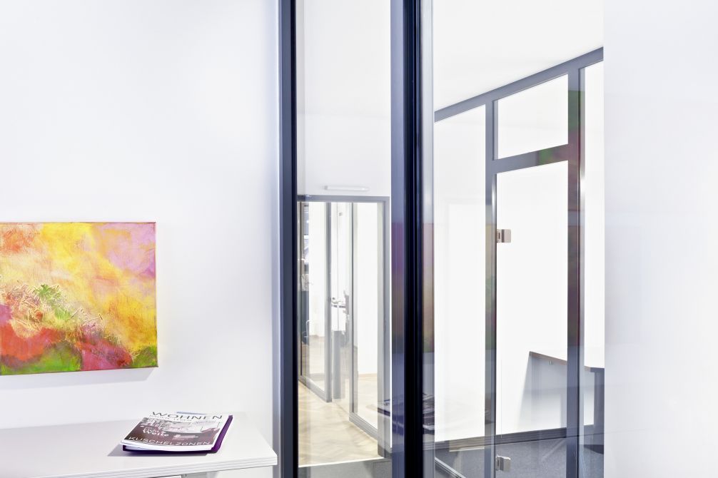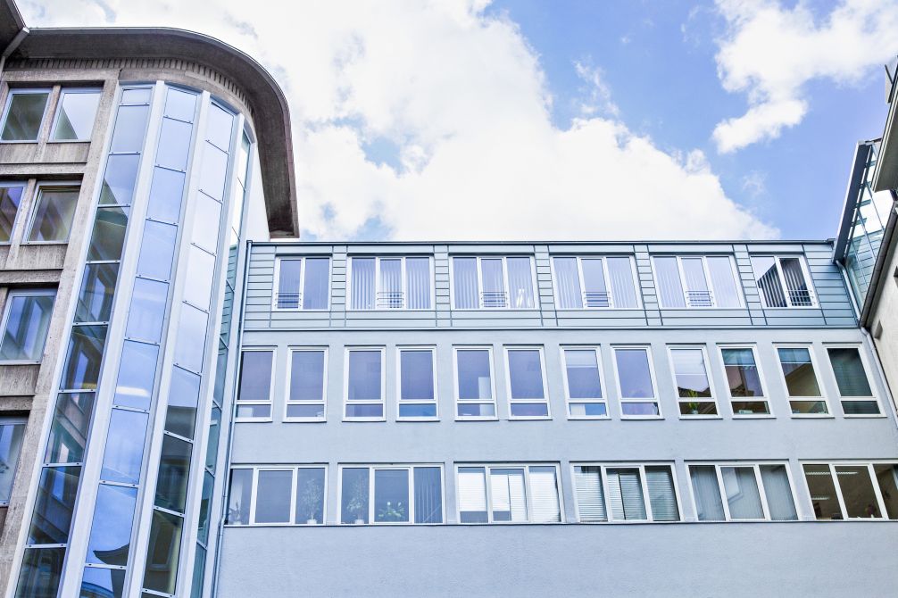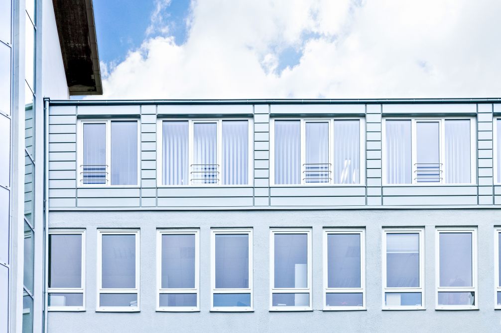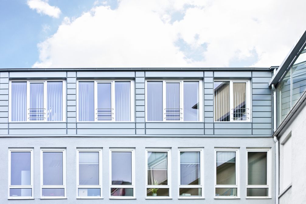 Die Aufstockung fügt sich durch die passenden grauen Aluminiumpaneele harmonisch in den gesamten Gebäudekomplex ein und bildete mit der darunter liegenden Putzfassade eine optische Einheit. Die Fensterformate des neuen Gebäudeteils wurden übernommen und weisen in neuem Zusammenhang eine eigenständige Formensprache auf.