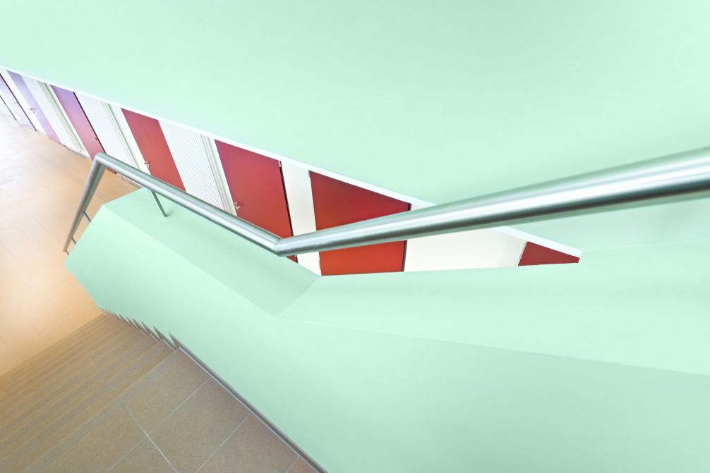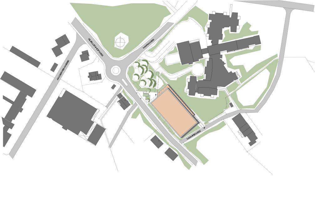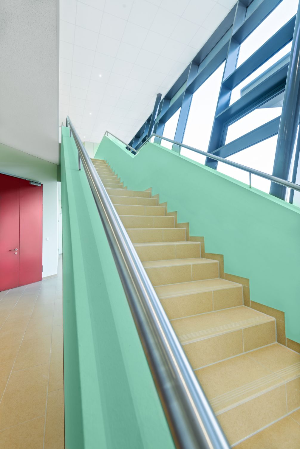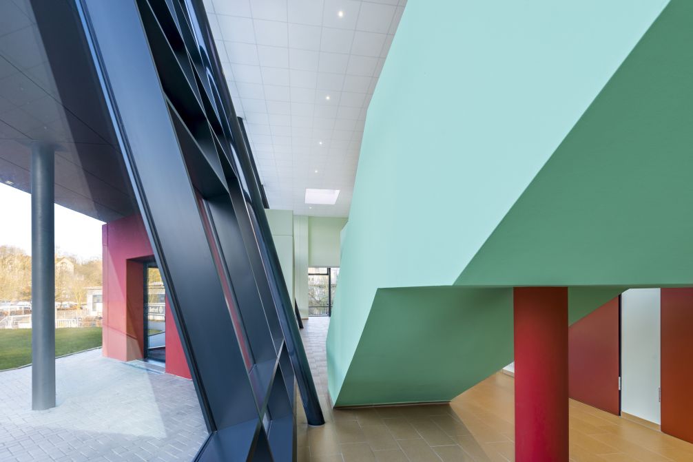 Durch diese Höhenabstaffelung in der Kubatur in Richtung Schule präsentiert sich der Baukörper an dieser Seite niedrig und transparent, der bestehenden Böschung der Hangkante folgend und diese baulich klar definierend.