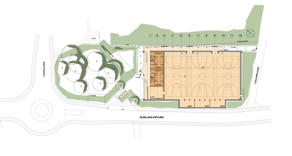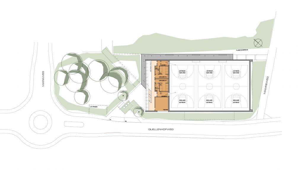 Unter Ausnutzung der Topographie wird ca. 1/3 des Hallenvolumens unterhalb des Terrains untergebracht, so dass sich der Hauptbaukörper entlang des Quellenhofweges nur mit einer niedrigen Attikahöhe darstellt, der Traufhöhe einer 1,5-geschossigen oder 2-geschossigen Wohnbebauung entsprechend, wie sie auf der anderen Straßenseite besteht, oder zukünftig entstehen könnte.