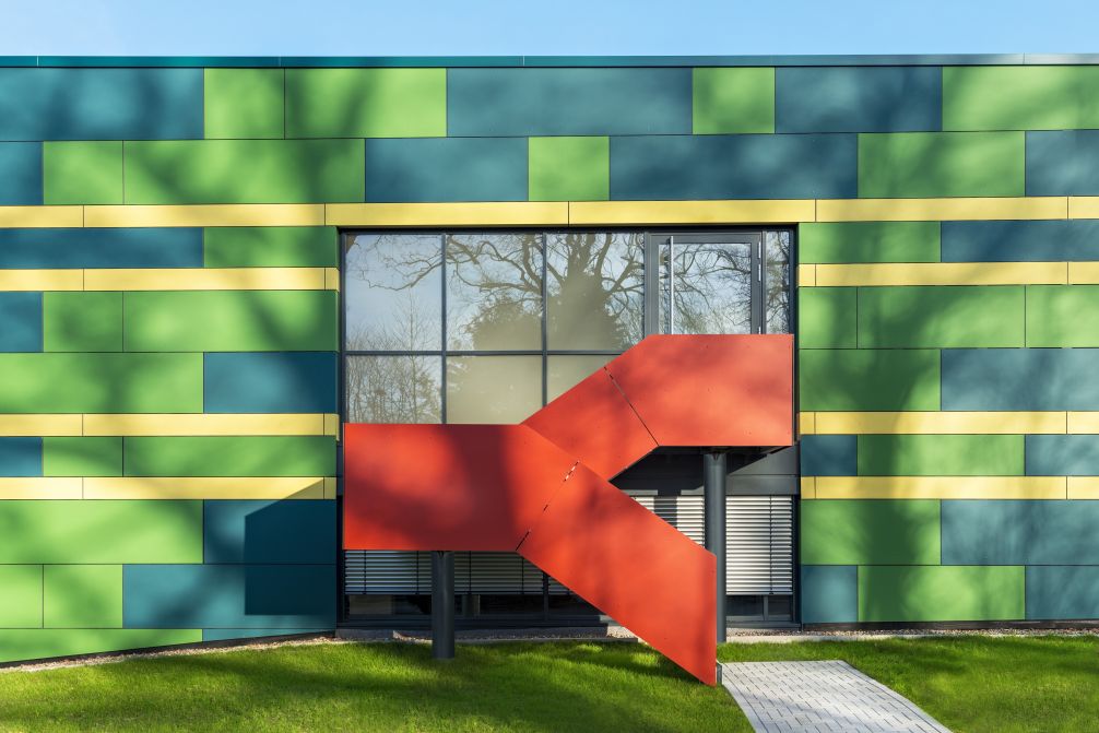 Der Haupteingang orientiert sich direkt zum Quellenhofweg und stellt sich markant, farbig abgesetzt unter einem auskragenden Vordach dar.