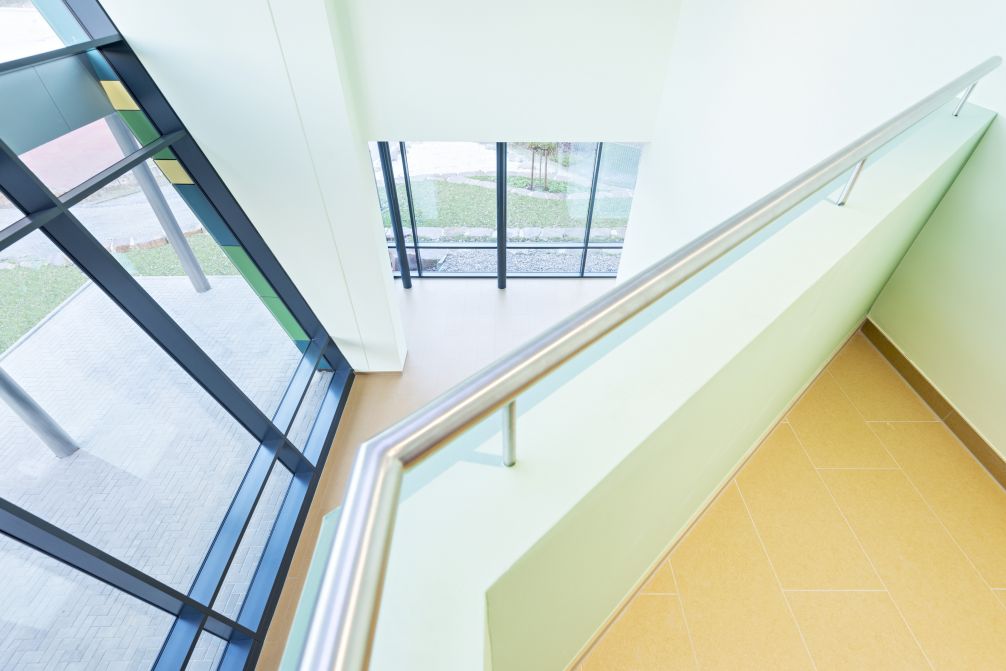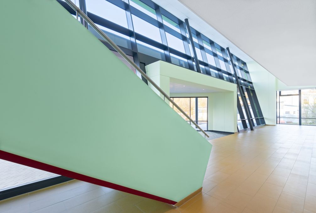 Südwestlich werden 1-geschossig der Eingangs- und Begegnungsbereich mit den Besuchereinrichtungen angelagert, aus der Hauptrichtung dem Quellenhofweg zugewandt, ausgeschwenkt, die Richtung des gegenüberliegenden Baukörpers der Schule aufnehmend.