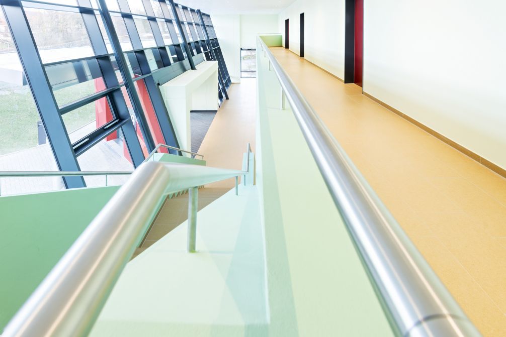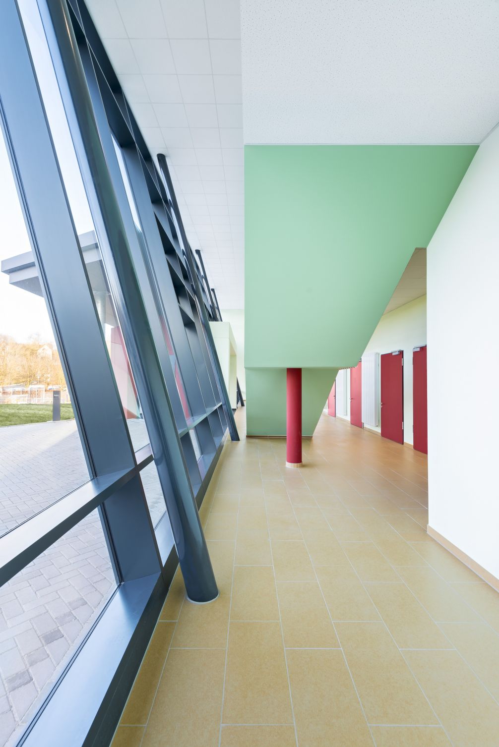 In direkter Anbindung an den Begegnungsbereich, parallel zum Hallenbaukörper, in nordwestlicher Richtung schließt sich der 1-geschossige, verglaste Erschließungsgang an.